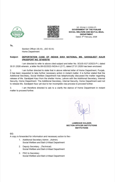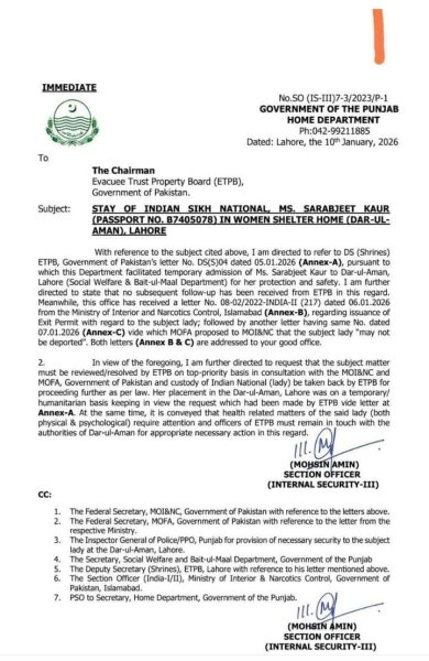 The Lahore High Court on Friday (February 6) continued hearings in the high-profile deportation case of Indian national Sarbjit Kaur also known as Noor Hussain, or Noor Fatima, who has been detained at a women’s shelter home in Lahore since early January over immigration and visa-related violations.Kaur, a 48 Year-old Sikh woman from Punjab, India, entered Pakistan on November 4, 2025, with a Sikh pilgrim group to attend Guru Nanak’s birth anniversary celebrations at Nankana Sahib. Her visa expired around November 13–14, but she stayed behind, reportedly converting to Islam, marrying Pakistani citizen Nasir Hussain from Sheikhupura, and taking the name Noor Hussain.Her overstay invoked legal provisions of Pakistan’s Foreigners Act, 1946, prompting authorities to detain her on January 4, 2026. An attempt to deport her via the Wagah-Attari border was delayed due to incomplete federal clearances and pending court petitions. She was later moved to the Dar-ul-Aman in Lahore for safety and legal processing.Government and Court Proceedings during Friday’s proceedings, officials from the Punjab Social Welfare and Bait-ul-Maal Department informed the court that Kaur would not be released from the shelter home without a formal special exit permit or specific court order. A departmental communication (Letter No. SO(inst.)1-12/2024 (P), dated February 4, 2026) was cited, seeking guidance from the Punjab Home Department on the deportation procedure.