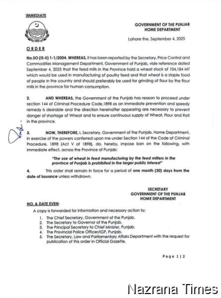 In a major decision to ensure uninterrupted supply of wheat for human consumption, the Government of Punjab has imposed an immediate ban on the use of wheat in all feed mills across the province. Section 144 has been enforced to guarantee the continuous availability of wheat, flour, and bread.