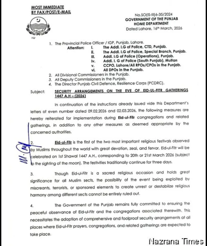 लाहौर, 17 मार्च 2026: ईद-उल-फितर के करीब आते ही पंजाब होम डिपार्टमेंट ने पूरे प्रांत में शांति और सुरक्षा सुनिश्चित करने के लिए व्यापक और बहु-स्तरीय सुरक्षा योजना लागू की है।