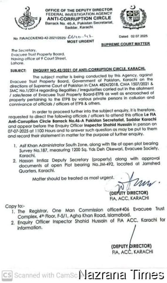 सुप्रीम कोर्ट की निगरानी में चल रही देशव्यापी जवाबदेही मुहिम के तहत एक बड़ा कदम उठाते हुए, फेडरल इन्वेस्टिगेशन एजेंसी (FIA) की एंटी-करप्शन सर्कल कराची ने इवैक्यूई ट्रस्ट प्रॉपर्टी बोर्ड (ETPB) के दो वरिष्ठ अधिकारियों को तलब किया है। जांच में कराची में अल्पसंख्यकों की जमीनों की गलत बिक्री, पट्टे और अवैध कब्जों से जुड़ी गड़बड़ियों की बात सामने आ रही है।
