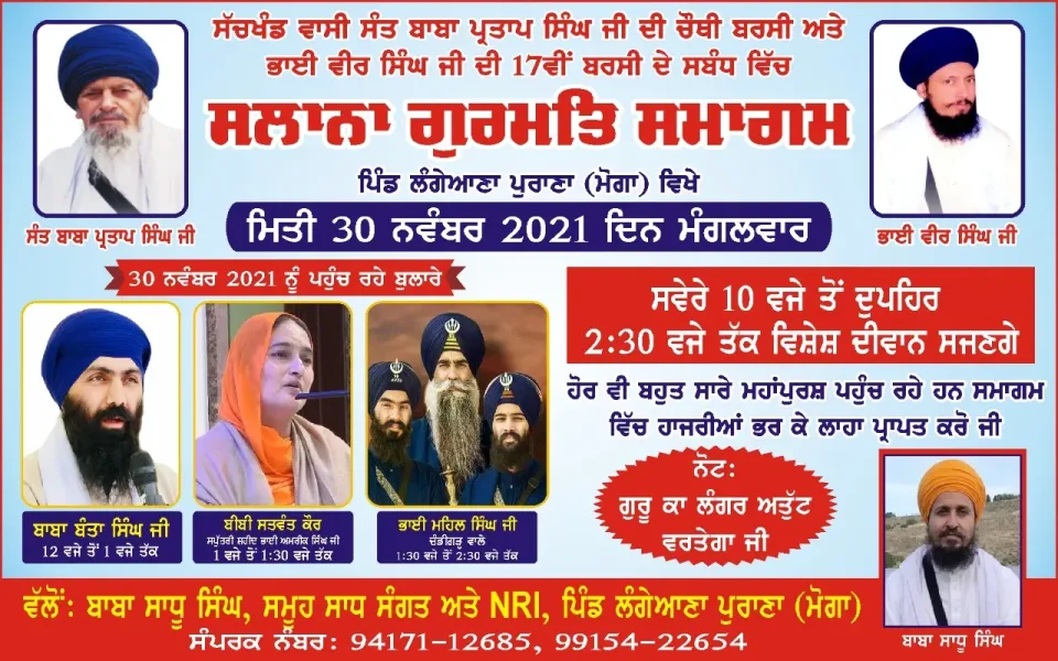 ਸੰਤ ਬਾਬਾ ਪ੍ਰਤਾਪ ਸਿੰਘ ਅਤੇ ਭਾਈ ਵੀਰ ਸਿੰਘ ਦੀ ਬਰਸੀ ਨੂੰ ਸਮਰਪਿਤ ਸਲਾਨਾ ਗੁਰਮਿਤ ਸਮਾਗਮ ਪਿੰਡ ਲੰਗੇਆਣਾ ਵਿਖੇ 30 ਨਵੰਬਰ ਨੂੰ