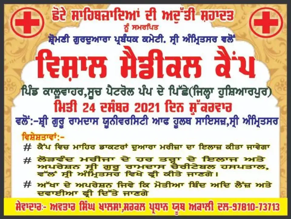 ਭੋਗਪੁਰ 21 ਦਸੰਬਰ (ਸੁਖ ਜੰਡੀਰ) ਸ਼੍ਰੋਮਣੀ ਗੁਰਦੁਆਰਾ ਪ੍ਰਬੰਧਕ ਕਮੇਟੀ ਸ੍ਰੀ ਅੰਮ੍ਰਿਤਸਰ ਵੱਲੋਂ ਛੋਟੇ ਸਾਹਿਬਜ਼ਾਦਿਆਂ ਦੀ ਅਦੁੱਤੀ ਸ਼ਹਾਦਤ ਨੂੰ ਸਮਰਪਿਤ ਵਿਸ਼ਾਲ ਮੈਡੀਕਲ ਕੈਂਪ ਪਿੰਡ ਕਾਲੂਵਾਹਰ, ਪੈਟਰੋਲ ਪੰਪ ਦੇ ਪਿੱਛੇ ਜ਼ਿਲ੍ਹਾ ਹੁਸ਼ਿਆਰਪੁਰ ਵਿਖੇ ਮਿਤੀ 24 ਦਸੰਬਰ 2021 ਦਿਨ ਸ਼ੁੱਕਰਵਾਰ ਨੂੰ ਲਗਾਇਆ ਜਾ ਰਿਹਾ ਹੈ। ਇਸ ਕੈਂਪ ਵਿੱਚ ਮਾਹਿਰ ਡਾਕਟਰਾਂ ਦੁਆਰਾ ਮਰੀਜ਼ਾਂ ਦੇ ਹਰ ਤਰ੍ਹਾਂ ਦੇ ਸਰੀਰਿਕ ਰੋਗਾਂ ਦਾ ਫਰੀ ਚੈੱਕਅੱਪ ਅਤੇ ਫ੍ਰੀ ਦਵਾਈਆਂ ਦਿੱਤੀਆਂ ਜਾਣਗੀਆਂ। ਅਤੇ ਅੱਖਾਂ ਦੇ ਆਪ੍ਰੇਸ਼ਨ, ਸ੍ਰੀ ਗੁਰੂ ਰਾਮਦਾਸ ਚੈਰੀਟੇਬਲ ਹਸਪਤਾਲ ਸ੍ਰੀ ਅੰਮ੍ਰਿਤਸਰ ਵਿਖੇ ਫਰੀ ਕੀਤੇ ਜਾਣਗੇ। ਕਿਸੇ ਵੀ ਮਰੀਜ਼ ਨੇ ਜੇਕਰ ਕੋਈ ਜਾਣਕਾਰੀ ਲੈਣੀ ਹੋਵੇ ਤਾਂ ਇਸ ਮੋਬਾਇਲ ਨੰਬਰ (97810-73713)ਤੇ ਸੰਪਰਕ ਕੀਤਾ ਜਾ ਸਕਦਾ ਹੈ। ਇਸ ਕੈਂਪ ਵਿੱਚ ਗੁਰੂ ਕੇ ਲੰਗਰ ਵੀ ਅਤੁੱਟ ਵਰਤਣਗੇ ।