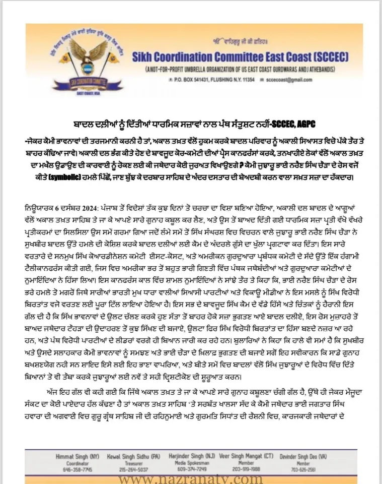 ਬਾਦਲ ਦਲ਼ੀਆਂ ਨੂੰ ਦਿੱਤੀਆਂ ਧਾਰਮਿਕ ਸਜ਼ਾਵਾਂ ਨਾਲ ਪੰਥ ਸੰਤੁਸ਼ਟ ਨਹੀਂ-SCCEC, AGPC