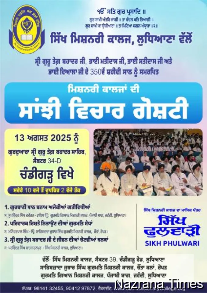 ਲੁਧਿਆਣਾ , ਗੁਰਜੀਤ ਸਿੰਘ ਅਜ਼ਾਦ-ਸਿੱਖ ਮਿਸ਼ਨਰੀ ਕਾਲਜ, ਲੁਧਿਆਣਾ ਵੱਲੋਂ 13 ਅਗਸਤ 2025 ਨੂੰ ਸ੍ਰੀ ਗੁਰੂ ਤੇਗ਼ ਬਹਾਦਰ ਜੀ, ਭਾਈ ਮਤੀਦਾਸ ਜੀ, ਭਾਈ ਸਤੀਦਾਸ ਜੀ ਅਤੇ ਭਾਈ ਦਿਆਲਾ ਜੀ ਦੇ 350ਵੇਂ ਸ਼ਹੀਦੀ ਸਾਲ ਨੂੰ ਸਮਰਪਿਤ “ਸਾਂਝੀ ਵਿਚਾਰ ਗੋਸ਼ਟੀ” ਦਾ ਆਯੋਜਨ ਕੀਤਾ ਜਾ ਰਿਹਾ ਹੈ। ਇਹ ਪ੍ਰੋਗਰਾਮ ਗੁਰਦੁਆਰਾ ਸ੍ਰੀ ਗੁਰੂ ਤੇਗ਼ ਬਹਾਦਰ ਸਾਹਿਬ, ਸੈਕਟਰ 34-D, ਚੰਡੀਗੜ੍ਹ ਵਿੱਚ ਸਵੇਰੇ 10 ਵਜੇ ਤੋਂ ਦੁਪਹਿਰ 2 ਵਜੇ ਤੱਕ ਹੋਵੇਗਾ।
