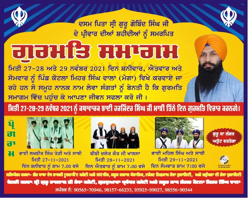 ਕੋਟਲਾ ਮਿਹਰ ਵਾਲਾ ਵਿਖੇ 27 ਨਵੰਬਰ ਤੋਂ ਰਾਤ ਦੇ ਗੁਰਮਤਿ ਸਮਾਗਮ ਸੁਰੂ