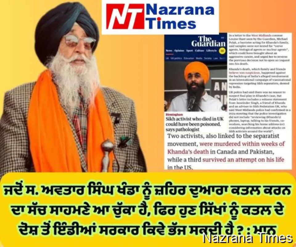 ਜਦੋਂ ਸ. ਅਵਤਾਰ ਸਿੰਘ ਖੰਡਾ ਨੂੰ ਜ਼ਹਿਰ ਦੁਆਰਾ ਕਤਲ ਕਰਨ ਦਾ ਸੱਚ ਸਾਹਮਣੇ ਆ ਚੁੱਕਾ ਹੈ, ਫਿਰ ਹੁਣ ਸਿੱਖਾਂ ਨੂੰ ਕਤਲ ਦੇ ਦੋਸ਼ ਤੋਂ ਇੰਡੀਆਂ ਸਰਕਾਰ ਕਿਵੇ ਭੱਜ ਸਕਦੀ ਹੈ ? : ਮਾਨ
