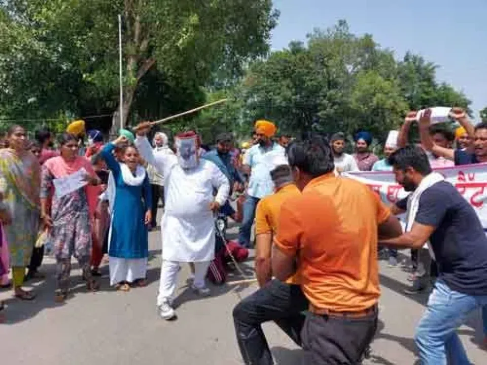 ਜਾਣਕਾਰੀ ਅਨੁਸਾਰ ਅੱਜ ਬੇਰੁਜ਼ਗਾਰ ਈਟੀਟੀ ਟੈੱਟ ਪਾਸ ਅਧਿਆਪਕ ਯੂਨੀਅਨ ਵੱਲੋਂ ਆਪਣੇ ਰੁਜ਼ਗਾਰ ਸਬੰਧੀ ਵਿਲੱਖਣ ਰੋਸ਼ ਪ੍ਰਦਰਸ਼ਨ ਕੀਤਾ ਗਿਆ। ਇਨ੍ਹਾਂ ਅਧਿਆਪਕਾਂ ਵੱਲੋਂ ਮੁੱਖ ਮੰਤਰੀ ਦੇ ਮੋਖੋਟੇ ਵਾਲਾ ਨਕਲੀ ਕੈਪਟਨ ਅਮਰਿੰਦਰ ਸਿੰਘ ਬਣਾਇਆ ਗਿਆ ਅਤੇ ਨਾਲ ਹੀ ਨਕਲੀ ਪੁਲਿਸ ਵਾਲੇ ਤਿਆਰ ਕੀਤੇ ਗਏ। ਕੁਝ ਬੇਰੁਜ਼ਗਾਰ ਅਧਿਆਪਕਾਂ ਵੱਲੋਂ ਆਪਣੇ ਆਪ ਨੂੰ ਸੰਗਲਾਂ ਵਿੱਚ ਨੂੜਿਆ ਹੋਇਆ ਸੀ। ਇਸ ਵਿਲੱਖਣ ਰੋਸ ਪ੍ਰਦਰਸ਼ਨ ਲਈ ਬੇਰੁਜ਼ਗਾਰ ਅਧਿਆਪਕ ਬੀਐਸਐਨਐਲ ਪਾਰਕ ਤੋਂ ਮੋਤੀ ਮਹਿਲ ਲਈ ਰਵਾਨਾ ਹੋਏ ਅਤੇ ਜਦੋਂ ਇਹ ਬੇਰੁਜ਼ਗਾਰ ਵਾਈਪੀਐਸ ਚੌਂਕ ‘ਚ ਪੁੱਜੇ ਤਾਂ ਉੱਥੇ ਵੱਡੀ ਗਿਣਤੀ ਵਿੱਚ ਪੁਲਿਸ ਫੋਰਸ ਤਾਇਨਾਤ ਸੀ। ਇਨ੍ਹਾਂ ਬੇਰੁਜ਼ਗਾਰਾਂ ਵੱਲੋਂ ਤਿਆਰ ਕੀਤੇ ਨਕਲੀ ਕੈਪਟਨ ਬਣੇ ਬੇਰੁਜ਼ਗਾਰ ਗੁਰਪ੍ਰੀਤ ਸਿੰਘ ਵੱਲੋਂ ਇਨ੍ਹਾਂ ਅਧਿਆਪਕਾਂ ਨੂੰ ਬੂਰੀ ਤਰ੍ਹਾਂ ਡੰਡੇ ਨਾਲ ਕੁੱਟਿਆ ਗਿਆ ਅਤੇ ਨਕਲੀ ਪੁਲਿਸ ਵੱਲੋਂ ਇਨ੍ਹਾਂ ਅਧਿਆਪਕਾਂ ਦੀ ਧੂਹ ਘੜੀਸ ਕੀਤੀ ਗਈ। ਵਾਈਪੀਐਸ ਚੌਂਕ ‘ਚ ਖੜ੍ਹੇ ਅਸਲੀ ਪੁਲਿਸ ਅਧਿਕਾਰੀ ਅਤੇ ਮੁਲਾਜ਼ਮ ਇਹ ਸਾਰਾ ਡਰਾਮਾ ਗਹੁ ਨਾਲ ਤੱਕ ਰਹੇ ਸਨ। ਅਸਲੀ ਪੁਲਿਸ ਵਾਲਿਆਂ ਦੀਆਂ ਡਾਂਗਾਂ ਅੱਜ ਹੱਥ ਵਿੱਚ ਹੀ ਫੜੀਆਂ ਰਹਿ ਗਈਆਂ। ਨਕਲੀ ਬਣਿਆ ਮੁੱਖ ਮੰਤਰੀ ਕੈਪਟਨ ਬੇਰੁਜ਼ਗਾਰਾਂ ‘ਤੇ ਡਾਗਾਂ ਮਾਰਦਾ ਆਖ ਰਿਹਾ ਸੀ ਕਿ ਆਓ ਤੁਹਾਨੂੰ ਰੁਜ਼ਗਾਰ ਦੇਵਾਂ। ਇਸ ਤੋਂ ਬਾਅਦ ਜਿਸ ਤਰ੍ਹਾਂ ਇਨ੍ਹਾਂ ਬੇਰੁਜ਼ਗਾਰਾਂ ਨਾਲ ਅਸਲੀ ਪੁਲਿਸ ਵੱਲੋਂ ਘੜੀਸਿਆ ਜਾਂਦਾ ਰਿਹਾ, ਉਸੇ ਤਰ੍ਹਾਂ ਨਕਲੀ ਪੁਲਿਸ ਬਣੇ ਬੇਰੁਜ਼ਗਾਰਾਂ ਵੱਲੋਂ ਆਪਣੇ ਸਾਥੀਆਂ ਨੂੰ ਘੜੀਸਿਆ ਗਿਆ। ਇਸ ਪ੍ਰਦਰਸ਼ਨ ਦੌਰਾਨ ਕਈ ਅਧਿਆਪਕਾਂ ਦੀਆਂ ਪੱਗਾਂ ਵੀ ਲਹਿ ਗਈਆਂ।