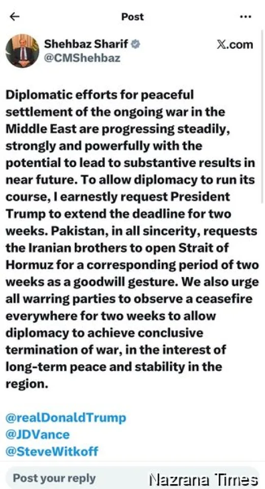"Diplomatic efforts for peaceful settlement of the ongoing war in the Middle East are progressing steadily, strongly and powerfully with the potential to lead to substantive results in near future. To allow diplomacy to run its course, I earnestly request President Trump to extend the deadline for two weeks. Pakistan, in all sincerity, requests the Iranian brothers to open Strait of Hormuz for a corresponding period of two weeks as a goodwill gesture. We also urge all warring parties to observe a ceasefire everywhere for two weeks to allow diplomacy to achieve conclusive termination of war, in the interest of long-term peace and stability in the region."