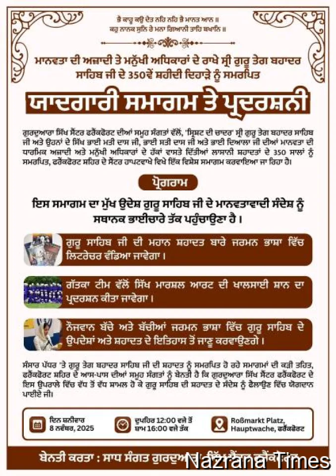 ਗੁਰੂ ਤੇਗ ਬਹਾਦਰ ਸਾਹਿਬ ਜੀ ਦੇ 350ਵੇਂ ਸ਼ਹੀਦੀ ਦਿਹਾੜੇ ਨੂੰ ਸਮਰਪਿਤ ਯਾਦਗਾਰੀ ਸਮਾਗਮ ਅਤੇ ਪ੍ਰਦਰਸ਼ਨੀ 8 ਨਵੰਬਰ ਨੂੰ