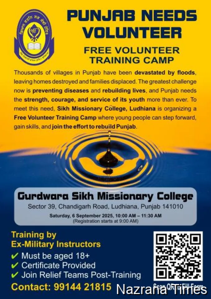 ਇਸੇ ਸੰਦਰਭ ਵਿੱਚ, ਸਿੱਖ ਮਿਸ਼ਨਰੀ ਕਾਲਜ, ਲੁਧਿਆਣਾ ਵੱਲੋਂ 6 ਸਤੰਬਰ 2025 (ਸ਼ਨੀਵਾਰ) ਨੂੰ ਇੱਕ ਮੁਫ਼ਤ ਵਲੰਟੀਅਰ ਟ੍ਰੇਨਿੰਗ ਕੈਂਪ ਆਯੋਜਿਤ ਕੀਤਾ ਜਾ ਰਿਹਾ ਹੈ। ਇਹ ਕੈਂਪ ਸਵੇਰੇ 10 ਵਜੇ ਤੋਂ 11:30AM ਤੱਕ ਗੁਰਦੁਆਰਾ ਸਿੱਖ ਮਿਸ਼ਨਰੀ ਕਾਲਜ, ਲੁਧਿਆਣਾ ਵਿਖੇ ਹੋਵੇਗਾ।