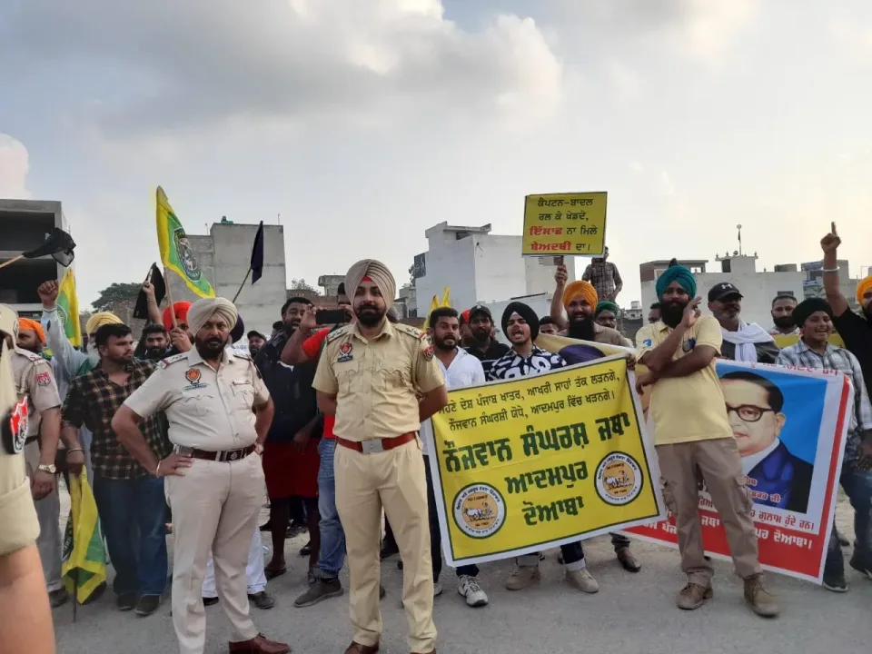 आदमपुर -( मनप्रीत कौर) किसान बिल्लों को लेकर नोजवान सँघर्ष जथा आदमपुर के बैनर तले गठजोड़ की बैठक का जबरदस्त विरोध कदरते हुए किसानों ने काले झंडे दिखाए व अकाली दल के विरोध में नारेबाजी की वहीं पुलिस प्रसाशन बड़ी गिनती में सुरक्षा के मधेनज़र वहां तैनात रहा जिसमें दो डीएसपी,एसएचओ सहित लेडी पुलिस बल भी मौजूद था,मीटिंग के बाद विधायक टीनू व समर्थकों को घेरने के लिए जैसे ही किसान आगे बढ़े तो पुलिस बल ने थोड़े बल का प्रयोग कर टीनू को उनके स्थानीय दफ्तर तक पैदल सुरक्षा घेरे में पहुंचा वापिस लौटे, टीनू ने कहा कि यह लोग असल में किसान हितेषी न होकर अपनी रोटियाँ सेंक रहे हैं जिन्हें समय जवाब देगा।मीटिंग का विरोध करते किसानों व पुलिस प्रसाशन को औरत व उसके बच्चों ने पिलाया पानी जिसकी किसन्त नेताओं ने की प्रसंसा।