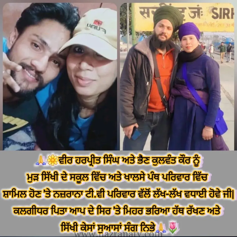 ਆਦਮਪੁਰ 28 ਦਸੰਬਰ ( ਤਰਨਜੋਤ ਸਿੰਘ ) ਬੀਬੀ ਮਨਪ੍ਰੀਤ ਕੌਰ ਦੀ ਪ੍ਰੇਰਨਾ ਅਤੇ ਗੁਰੂ ਸਾਹਿਬ ਜੀ ਦੀ ਕਿਰਪਾ ਨਾਲ ਵੀਰ ਹਰਪ੍ਰੀਤ ਸਿੰਘ ਅਤੇ ਭੈਣ ਕੁਲਵੰਤ ਕੌਰ ਨੂੰ ਮੁੜ ਸਿੱਖੀ ਦੇ ਸਕੂਲ ਵਿੱਚ ਅਤੇ ਖਾਲਸੇ ਪੰਥ ਪਰਿਵਾਰ ਵਿੱਚ ਸ਼ਾਮਿਲ ਹੋਣ 'ਤੇ ਨਜ਼ਰਾਨਾ ਟੀ.ਵੀ ਪਰਿਵਾਰ ਵੱਲੋਂ ਲੱਖ-ਲੱਖ ਵਧਾਈ ਹੋਵੇ ਜੀ। ਕਲਗੀਧਰ ਪਿਤਾ ਆਪ ਦੇ ਸਿਰ 'ਤੇ ਮਿਹਰ ਭਰਿਆ ਹੱਥ ਰੱਖਣ ਅਤੇ ਸਿੱਖੀ ਕੇਸਾਂ ਸੁਆਸਾਂ ਸੰਗ ਨਿਭੇ ।
