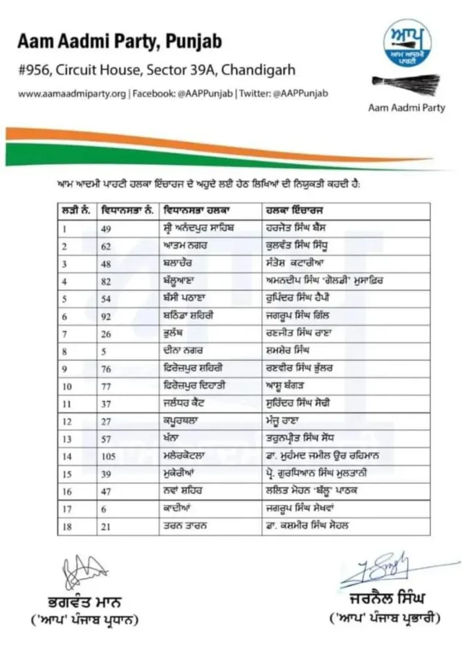ਆਮ ਆਦਮੀ ਪਾਰਟੀ ਵਲੋਂ 18 ਵਿਧਾਨ ਸਭਾ ਹਲਕਿਆਂ ਲਈ ਹਲਕਾ ਇੰਚਾਰਜਾਂ ਦਾ ਐਲਾਨ