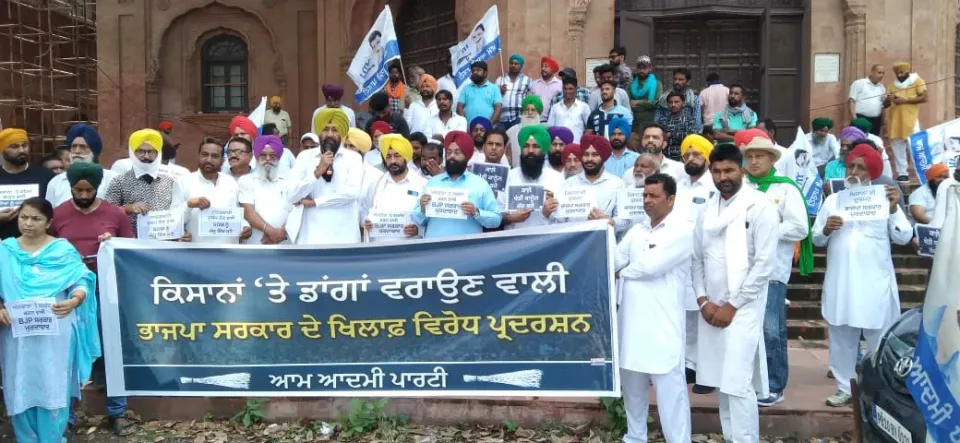 ਆਮ ਆਦਮੀ ਪਾਰਟੀ ਨੇ ਕਿਸਾਨਾਂ 'ਤੇ ਹੋਏ ਅੱਤਿਆਚਾਰਾਂ ਖ਼ਿਲਾਫ਼ ਕੀਤਾ ਭਾਜਪਾ ਸਰਕਾਰ ਦਾ ਪੁਤਲਾ ਫੂਕ ਪ੍ਰਦਰਸ਼ਨ
