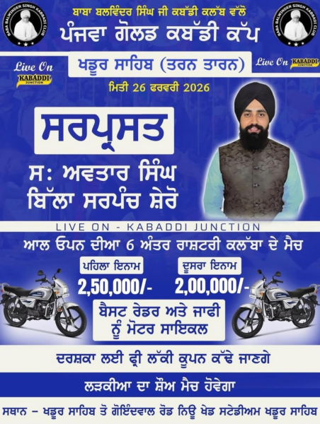 ਅਵਤਾਰ ਸਿੰਘ ਬਿੱਲਾ ਸ਼ੇਰੋਂ ਵਲੋਂ ਖਡੂਰ ਸਾਹਿਬ ਵਿਖੇ ਆਲ ਓਪਨ ਗੋਲਡ ਕਬੱਡੀ 26 ਨੂੰ