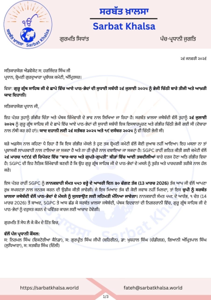 ਸਰਬੱਤ ਖ਼ਾਲਸਾ ਜਥੇਬੰਦੀ ਵੱਲੋਂ ਗੁਰੂ ਗ੍ਰੰਥ ਸਾਹਿਬ ਜੀ ਦੀਆਂ ਪਾਵਨ ਬੀੜਾਂ ਦੇ ਛਾਪੇ ਵਿੱਚ ਆਏ ਪਾਠ-ਵੇਦਾਂ ਦੀ ਸੁਧਾਈ ਦੇ ਮਸਲੇ 'ਤੇ ਸ਼੍ਰੋਮਣੀ ਗੁਰਦੁਆਰਾ ਪ੍ਰਬੰਧਕ ਕਮੇਟੀ (SGPC) ਨੂੰ ਤੀਜੀ ਅਤੇ ਆਖ਼ਰੀ ਯਾਦ-ਦਿਹਾਨੀ ਚਿੱਠੀ ਭੇਜੀ ਗਈ ਹੈ. ਜਥੇਬੰਦੀ ਨੇ ਦੋਸ਼ ਲਾਇਆ ਹੈ ਕਿ ਲੰਬੇ ਸਮੇਂ ਤੋਂ ਇਸ ਗੰਭੀਰ ਪੰਥਕ ਮਸਲੇ 'ਤੇ ਸ਼੍ਰੋਮਣੀ ਕਮੇਟੀ ਵੱਲੋਂ ਵੱਟੀ ਗਈ ਚੁੱਪ ਕੰਮ ਲਈ ਚਿੰਤਾ ਦਾ ਵਿਸ਼ਾ ਹੈ ਤਿੰਨ ਵਾਰ ਭੇਜੀਆਂ ਗਈਆਂ ਯਾਦ-ਦਿਹਾਨੀਆਂ ਸਰਬੱਤ ਖ਼ਾਲਸਾ ਜਥੇਬੰਦੀ ਅਨੁਸਾਰ ਉਨ੍ਹਾਂ ਨੇ ਸਭ ਤੋਂ ਪਹਿਲਾਂ 26 ਜੁਲਾਈ 2025 ਨੂੰ ਪਾਠ-ਭੇਦਾਂ ਦੀ ਸੁਧਾਈ ਸਬੰਧੀ ਇੱਕ ਵਿਸਥਾਰਪੂਰਣ ਚਿੱਠੀ ਭੇਜੀ ਸੀ । ਇਸ ਤੋਂ ਬਾਅਦ ਸ਼੍ਰੋਮਣੀ ਕਮੇਟੀ ਨੂੰ ਜਗਾਉਣ ਲਈ 26 ਸਤੰਬਰ 2025 ਅਤੇ 19 ਦਸੰਬਰ 2025 ਨੂੰ ਵੀ ਯਾਦ-ਦਿਹਾਨੀ ਪੱਤਰ ਭੇਜੇ ਗਏ, ਪਰ ਕਮੇਟੀ ਵੱਲੋਂ ਅਜੇ ਤੱਕ ਕੋਈ ਹੁੰਗਾਰਾ ਨਹੀਂ ਮਿਲਿਆ।