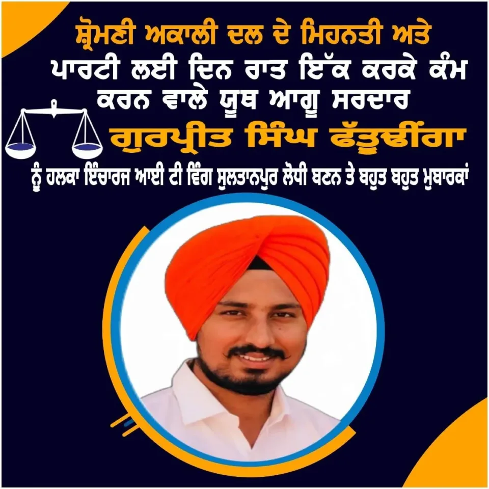 ਗੁਰਪ੍ਰੀਤ ਸਿੰਘ ਫੱਤੂਢੀਂਗਾ ਸ਼੍ਰੋਮਣੀ ਅਕਾਲੀ ਦਲ ਦੇ ਆਈ ਟੀ ਵਿੰਗ ਦੇ ਸੁਲਤਾਨਪੁਰ ਲੋਧੀ ਤੋਂ ਹਲਕਾ ਇੰਚਾਰਜ ਬਣੇ
