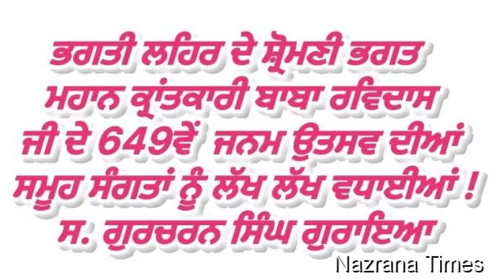ਭਗਤੀ ਲਹਿਰ ਦੇ ਸ਼੍ਰੋਮਣੀ ਭਗਤ ਮਹਾਨ ਕ੍ਰਾਂਤਕਾਰੀ ਬਾਬਾ ਰਵਿਦਾਸ ਜੀ ਦੇ 649ਵੇਂ ਜਨਮ ਉਤਸਵ ਦੀਆਂ ਸਮੂਹ ਸੰਗਤਾਂ ਨੂੰ ਲੱਖ ਲੱਖ ਵਧਾਈਆਂ !