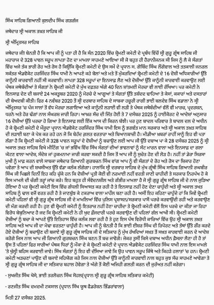 ਲਾਪਤਾ 328 ਪਾਵਨ ਸਰੂਪਾਂ ਦੇ ਮਾਮਲੇ 'ਚ ਸ੍ਰੀ ਗੁਰੂ ਗ੍ਰੰਥ ਸਾਹਿਬ ਸਤਿਕਾਰ ਕਮੇਟੀ ਦੇ ਪ੍ਰਧਾਨ ਭਾਈ ਸੁਖਜੀਤ ਸਿੰਘ ਖੋਸੇ, ਸਿੱਖ ਯੂਥ ਫੈਡਰੇਸ਼ਨ ਭਿੰਡਰਾਂਵਾਲਾ ਦੇ ਪ੍ਰਧਾਨ ਭਾਈ ਰਣਜੀਤ ਸਿੰਘ ਦਮਦਮੀ ਟਕਸਾਲ ਅਤੇ ਭਾਈ ਤਰਲੋਚਨ ਸਿੰਘ ਸੋਹਲ ਨੇ ਸ੍ਰੀ ਅਕਾਲ ਤਖ਼ਤ ਸਾਹਿਬ ਦੇ ਜਥੇਦਾਰ ਗਿਆਨੀ ਕੁਲਦੀਪ ਸਿੰਘ ਗੜਗੱਜ ਨੂੰ ਈਮੇਲ ਰਾਹੀਂ ਚਿੱਠੀ ਭੇਜੀ ਹੈ ਜਿਸ ਵਿੱਚ ਲਿਖਿਆ ਹੈ ਕਿ ਜਥੇਦਾਰ ਜੀ! ਬੇਨਤੀ ਹੈ ਕਿ ਆਪ ਜੀ ਨੂੰ ਪਤਾ ਹੀ ਹੈ ਕਿ ਸੰਨ 2020 ਵਿੱਚ ਸ਼੍ਰੋਮਣੀ ਕਮੇਟੀ ਦੇ ਪ੍ਰਬੰਧ ਵਿੱਚੋਂ ਸ੍ਰੀ ਗੁਰੂ ਗ੍ਰੰਥ ਸਾਹਿਬ ਜੀ ਮਹਾਰਾਜ ਦੇ 328 ਪਾਵਨ ਸਰੂਪ ਲਾਪਤਾ ਹੋਣ ਦਾ ਮਾਮਲਾ ਸਾਹਮਣੇ ਆਇਆ ਸੀ ਜੋ ਬਹੁਤ ਹੀ ਹੈਰਾਨੀਜਨਕ ਸੀ ਜਿਸ ਨੂੰ ਲੈ ਕੇ ਸੰਗਤਾਂ ਵਿੱਚ ਅਜੇ ਤੱਕ ਭਾਰੀ ਰੋਹ ਅਤੇ ਰੋਸ ਹੈ ਕਿਉਂਕਿ ਸ਼੍ਰੋਮਣੀ ਕਮੇਟੀ ਦੇ ਉਸ ਸਮੇਂ ਦੇ ਪ੍ਰਧਾਨ ਸ. ਗੋਬਿੰਦ ਸਿੰਘ ਲੌਂਗੋਵਾਲ ਅਤੇ ਤਤਕਾਲੀ ਜਨਰਲ ਸਕੱਤਰ ਐਡਵੋਕੇਟ ਹਰਜਿੰਦਰ ਸਿੰਘ ਧਾਮੀ ਨੇ ਆਪਣੇ ਕਹੇ ਬੋਲਾਂ ਅਤੇ ਮਤੇ ਤੋਂ ਮੁੱਕਰਦਿਆਂ ਸ਼੍ਰੋਮਣੀ ਕਮੇਟੀ ਦੇ 16 ਦੋਸ਼ੀ ਅਧਿਕਾਰੀਆਂ ਉੱਤੇ ਕਾਨੂੰਨੀ ਕਾਰਵਾਈ ਨਹੀਂ ਸੀ ਕਰਵਾਈ। ਲਾਪਤਾ 328 ਸਰੂਪਾਂ ਦਾ ਇਨਸਾਫ਼ ਲੈਣ ਅਤੇ ਦੋਸ਼ੀਆਂ ਉੱਤੇ ਕਾਨੂੰਨੀ ਕਾਰਵਾਈ ਕਰਵਾਉਣ ਲਈ ਪੰਥਕ ਜਥੇਬੰਦੀਆਂ ਤੇ ਸੰਗਤਾਂ ਨੇ ਸ਼੍ਰੋਮਣੀ ਕਮੇਟੀ ਦੇ ਮੁੱਖ ਦਫ਼ਤਰ ਅੱਗੇ 40 ਦਿਨ ਸ਼ਾਂਤਮਈ ਮੋਰਚਾ ਵੀ ਲਾਈ ਰੱਖਿਆ। ਪਰ ਕਮੇਟੀ ਨੇ ਇਨਸਾਫ਼ ਦੇਣ ਦੀ ਬਜਾਏ 24 ਅਕਤੂਬਰ 2020 ਨੂੰ ਮੋਰਚੇ ਦੇ ਆਗੂਆਂ ਤੇ ਸੰਗਤਾਂ ਉੱਤੇ ਤਸ਼ੱਦਦ ਢਾਹਿਆ ਤੇ ਕੇਸਾਂ, ਕਕਾਰਾਂ ਅਤੇ ਦਸਤਾਰਾਂ ਦੀ ਬੇਅਦਬੀ ਕੀਤੀ। ਫਿਰ 4 ਨਵੰਬਰ 2020 ਤੋਂ ਸ੍ਰੀ ਦਰਬਾਰ ਸਾਹਿਬ ਦੇ ਸਾਬਕਾ ਹਜ਼ੂਰੀ ਰਾਗੀ ਭਾਈ ਬਲਦੇਵ ਸਿੰਘ ਵਡਾਲਾ ਨੇ ਸ੍ਰੀ ਅੰਮ੍ਰਿਤਸਰ 'ਚ ਪੰਜ ਸਾਲਾਂ ਤੋਂ ਵੱਧ ਮੋਰਚਾ ਲਗਾਇਆ ਅਤੇ ਕਾਨੂੰਨੀ ਲੜਾਈ ਵੀ ਲੜੀ ਤੇ ਪੰਥਕ ਜਥੇਬੰਦੀਆਂ ਵੱਲੋਂ ਵੀ ਮਾਰਚ, ਪ੍ਰਦਰਸ਼ਨ, ਧਰਨੇ ਅਤੇ ਹੋਰ ਢੰਗਾਂ ਨਾਲ ਸੰਘਰਸ਼ ਜਾਰੀ ਰਿਹਾ। ਆਖ਼ਰ ਸੱਚ ਦੀ ਜਿੱਤ ਹੋਈ ਤੇ 7 ਦਸੰਬਰ 2025 ਨੂੰ ਹਾਈਕੋਰਟ ਦੇ ਆਦੇਸ਼ਾਂ ਅਨੁਸਾਰ 16 ਦੋਸ਼ੀਆਂ ਉੱਤੇ ਪਰਚਾ ਹੋ ਗਿਆ ਤੇ ਇਨਸਾਫ਼ ਲਈ ਇੱਕ ਆਸ ਦੀ ਕਿਰਨ ਬੱਝੀ। ਪਰ ਹੁਣ ਬਾਦਲ ਪਰਿਵਾਰ ਤੇ ਬਾਦਲ ਦਲ ਦੇ ਅਧੀਨ ਹੋ ਕੇ ਸ਼੍ਰੋਮਣੀ ਕਮੇਟੀ ਦੇ ਮੌਜੂਦਾ ਪ੍ਰਧਾਨ ਐਡਵੋਕੇਟ ਹਰਜਿੰਦਰ ਸਿੰਘ ਧਾਮੀ ਇਸ ਨੂੰ ਭਗਵੰਤ ਮਾਨ ਸਰਕਾਰ ਅਤੇ ਸ੍ਰੀ ਅਕਾਲ ਤਖ਼ਤ ਸਾਹਿਬ ਦੀ ਲੜਾਈ ਬਣਾ ਕੇ ਪੇਸ਼ ਕਰ ਰਹੇ ਹਨ ਜੋ ਕਿ ਬੇਹੱਦ ਗ਼ਲਤ ਵਰਤਾਰਾ ਅਤੇ ਬਿਆਨਬਾਜ਼ੀ ਹੈ। ਮੀਡੀਆ ਖ਼ਬਰਾਂ ਰਾਹੀਂ ਸਾਨੂੰ ਇਹ ਵੀ ਪਤਾ ਲੱਗਾ ਹੈ ਕਿ ਸ਼੍ਰੋਮਣੀ ਕਮੇਟੀ ਜੋ 328 ਪਾਵਨ ਸਰੂਪਾਂ ਦੇ ਦੋਸ਼ੀਆਂ ਨੂੰ ਬਚਾਉਣ ਲਈ ਆਪ ਜੀ ਉੱਤੇ ਦਬਾਅ ਪਾ ਕੇ 28 ਦਸੰਬਰ 2025 ਨੂੰ ਸ੍ਰੀ ਅਕਾਲ ਤਖ਼ਤ ਸਾਹਿਬ ਵਿਖੇ ਮੀਟਿੰਗ 'ਚ ਜਾਂ ਭਵਿੱਖ ਵਿੱਚ ਸਿੱਖ ਸੰਗਤਾਂ ਦੀਆਂ ਭਾਵਨਾਵਾਂ ਨੂੰ ਸੱਟ ਮਾਰਨ ਵਾਲਾ ਅਤੇ ਇਨਸਾਫ਼ ਦਾ ਗਲਾ ਘੋਟਣ ਵਾਲਾ ਆਦੇਸ਼, ਸੰਦੇਸ਼ ਜਾਂ ਹੁਕਮਨਾਮਾ ਜਾਰੀ ਕਰਵਾ ਸਕਦੀ ਹੈ ਜਿਸ ਤੋਂ ਆਪ ਜੀ ਨੂੰ ਸੁਚੇਤ ਹੋਣ ਦੀ ਲੋੜ ਹੈ। ਨਹੀਂ ਤਾਂ ਡੇਰਾ ਸਿਰਸਾ ਮੁਖੀ ਨੂੰ ਮਾਫ਼ ਕਰਨ ਵਾਲੇ ਸਾਬਕਾ ਜਥੇਦਾਰ ਗਿਆਨੀ ਗੁਰਬਚਨ ਸਿੰਘ ਵਾਂਗ ਆਪ ਨੂੰ ਵੀ ਸੰਗਤਾਂ ਦੇ ਰੋਹ ਅਤੇ ਰੋਸ ਦਾ ਸ਼ਿਕਾਰ ਹੋਣਾ ਪਵੇਗਾ ਤੇ ਆਪ ਦੀ ਸ਼ਖਸੀਅਤ ਉੱਤੇ ਵੱਡਾ ਕਲੰਕ ਲੱਗੇਗਾ।