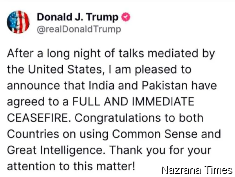 ਟਰੁੱਥ ਉੱਤੇ ਪਾਈ ਇਕ ਪੋਸਟ ਵਿਚ ਅਮਰੀਕੀ ਰਾਸ਼ਟਰਪਤੀ ਨੇ ਕਿਹਾ ਕਿ ਸੰਯੁਕਤ ਰਾਜ ਅਮਰੀਕਾ ਦੁਆਰਾ ਵਿਚੋਲਗੀ ਦੀ ਇੱਕ ਲੰਮੀ ਰਾਤ ਦੀ ਗੱਲਬਾਤ ਤੋਂ ਬਾਅਦ, ਮੈਨੂੰ ਇਹ ਐਲਾਨ ਕਰਦੇ ਹੋਏ ਖੁਸ਼ੀ ਹੋ ਰਹੀ ਹੈ ਕਿ ਭਾਰਤ ਅਤੇ ਪਾਕਿਸਤਾਨ ਇੱਕ ਪੂਰਨ ਅਤੇ ਤੁਰੰਤ ਜੰਗਬੰਦੀ ਲਈ ਸਹਿਮਤ ਹੋ ਗਏ ਹਨ। ਕਾਮਨ ਸੈਂਸ ਅਤੇ ਮਹਾਨ ਬੁੱਧੀ ਦੀ ਵਰਤੋਂ ਕਰਨ ਲਈ ਦੋਵਾਂ ਦੇਸ਼ਾਂ ਨੂੰ ਵਧਾਈਆਂ। ਇਸ ਮਾਮਲੇ ਵੱਲ ਤੁਹਾਡਾ ਧਿਆਨ ਦੇਣ ਲਈ ਤੁਹਾਡਾ ਧੰਨਵਾਦ!